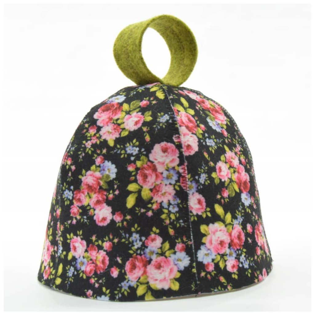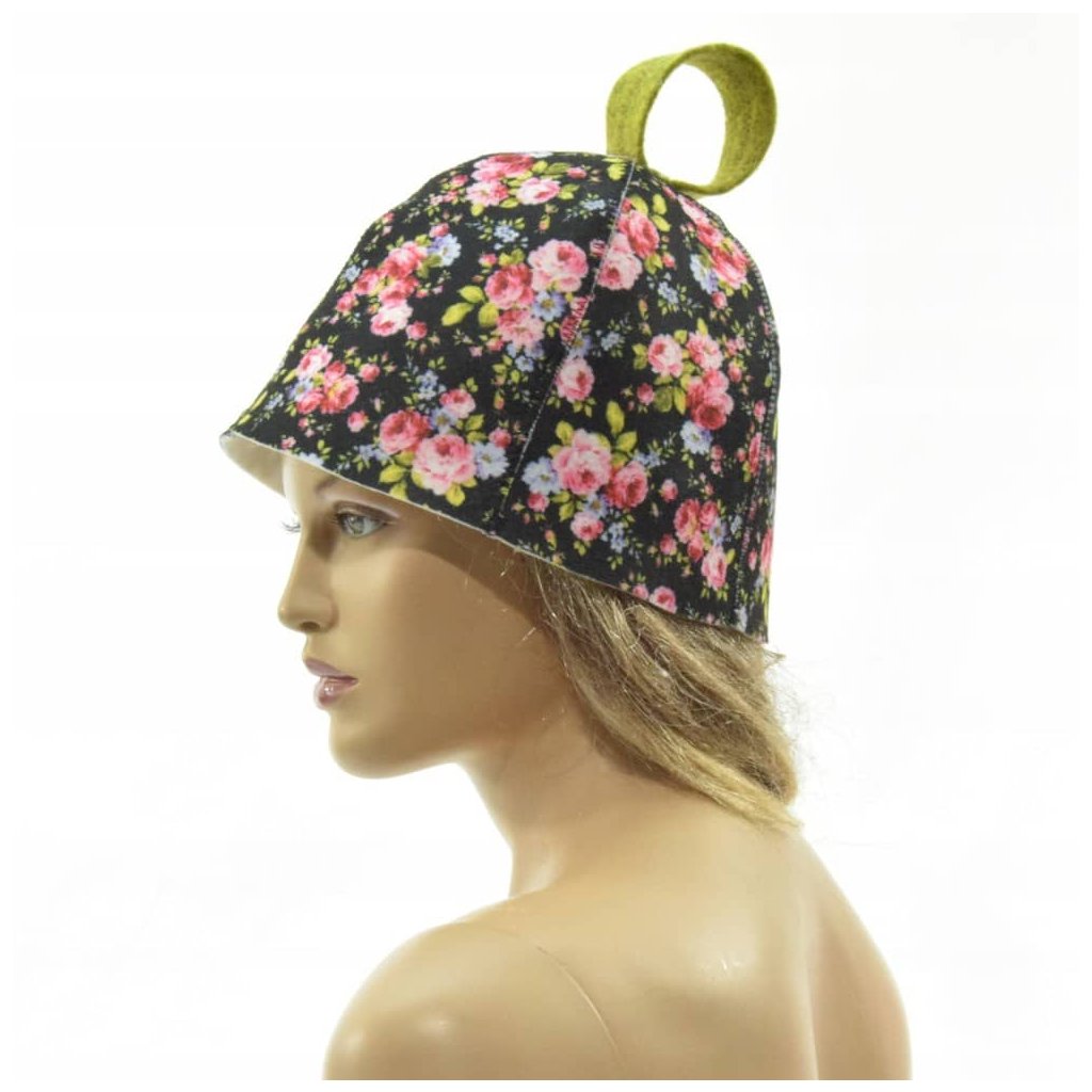 Saunová čepice zvonek – černá s květinovým vzorem, polyester filc