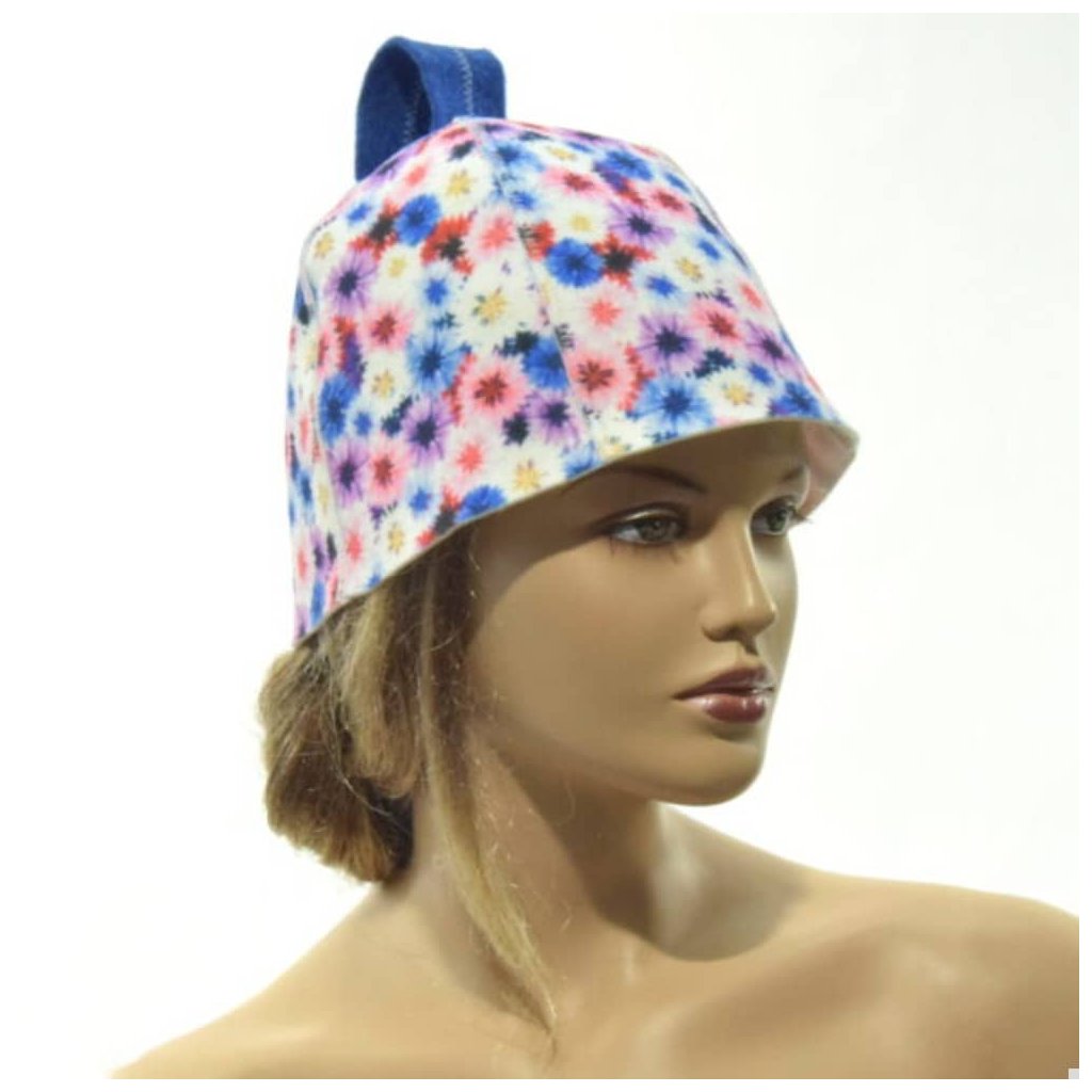 Saunová čepice – zvonek s modrými kytičkami, polyester filc